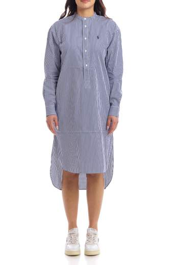 Abito in cotone da donna, modello chemisier lungo con colletto alla coreana e maniche lunghe, fantasia a righe blu navy e bianche. Chiusura con bottoni, spacchi laterali per esaltare la silhouette, lunghezza fino al polpaccio